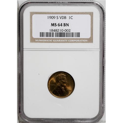 <B>1909-S VDB<1C> MS64 Brown NGC.</B></I> The patina of this piece is violet-brown and mellowed mahogany-orange. Choice with a typical strike for this key issue and no major distractions.