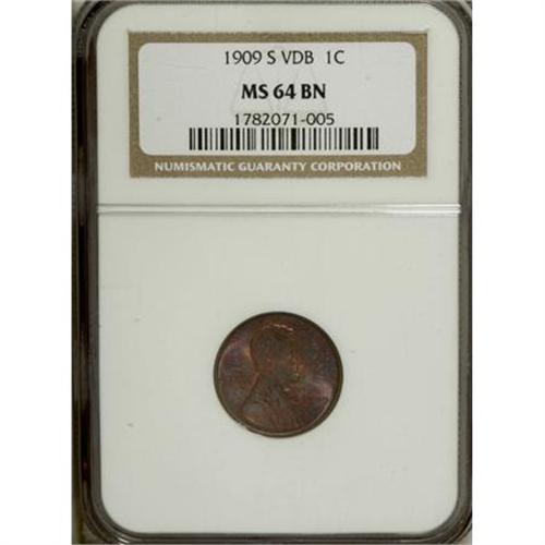 <B>1909-S VDB 1C MS64 Brown NGC.</B></I> Vivid magenta and amethyst color dominates both sides, while a measure of copper-orange appears near the devices. A well-defined representative of this classic issue, one that approaches the century mark.<BR><BR><b>Shipping:</b> Coins & Currency (<a target="_blank" href="http://www.heritageauctions.com/common/shipping.php">view shipping information</a>)