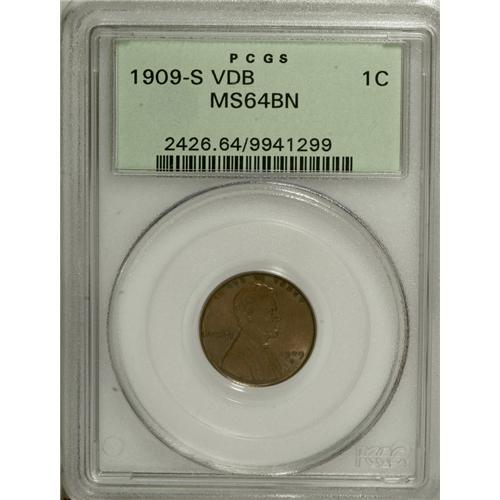 <B>1909-S VDB 1C MS64 Brown PCGS.</B></I> A beautiful Brown coin with no trace of carbon. All three periods in the designers' initials are bold. This well-struck and pleasingly preserved near-Gem has good luster. And impressive example of this endlessly coveted low mintage issue.<BR><BR><b>Shipping:</b> Coins & Currency (<a target="_blank" href="http://www.heritageauctions.com/common/shipping.php">view shipping information</a>)