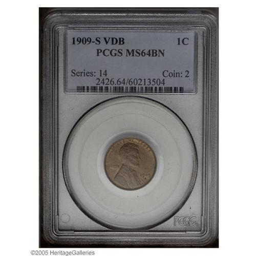<B>1909-S VDB<1C> MS64 Brown PCGS.</B></I> A handsome wood-grain near-Gem, essentially void of contact. A faint retained lamination (as made) on the portrait, and each side has a speck or two of carbon near 3 o'clock.