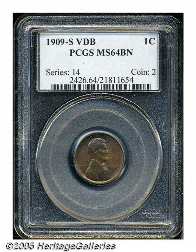 <B>1909-S VDB<1C> MS64 Brown PCGS.</B></I> One of the favorites of Lincoln cent collectors, this key date has relatively sharply defined design features and excellent luster. The warm golden-brown surfaces are wonderfully preserved, revealing no mentionable contact marks or carbon spots. One tiny fleck in the lower reverse is mentioned for accuracy, but in no way detracts from the overall eye appeal of this highly attractive near Gem.