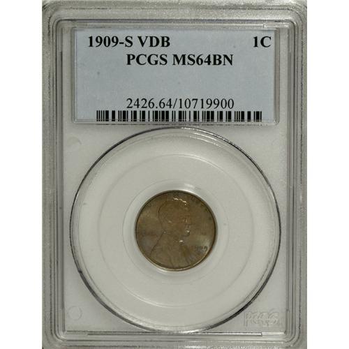<B>1909-S VDB 1C MS64 Brown PCGS.</B></I> The medium brown centers are framed by sea-green and lilac. The VDB initials are fully struck, and the remainder of the design is also intricate. A lustrous and beautiful example of this perennial collector favorite.<BR><BR><b>Shipping:</b> Coins & Currency (<a target="_blank" href="http://www.heritageauctions.com/common/shipping.php">view shipping information</a>)