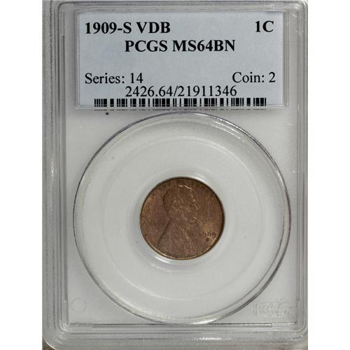 <B>1909-S VDB 1C MS64 Brown PCGS.</B></I> Well struck with vibrant luster and a dark woodgrain texture on both sides that is not at all unattractive. A carefully preserved and blemish-free example of this ever-popular Lincoln cent key date.<BR><BR><b>Shipping:</b> Coins & Currency (<a target="_blank" href="http://www.heritageauctions.com/common/shipping.php">view shipping information</a>)