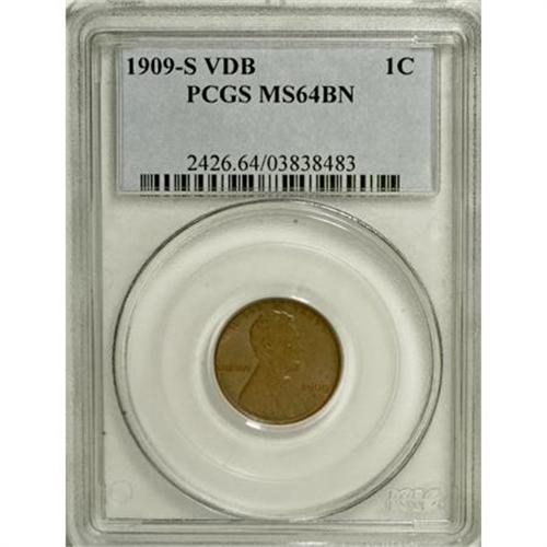 <B>1909-S VDB 1C MS64 Brown PCGS.</B></I> This needle-sharp and satiny Choice key date cent is nearly void of contact, and carbon is also minimal. Golden-brown and olive with glimpses of faded mint red near the margins.<BR><BR><b>Shipping:</b> Coins & Currency (<a target="_blank" href="http://www.heritageauctions.com/common/shipping.php">view shipping information</a>)