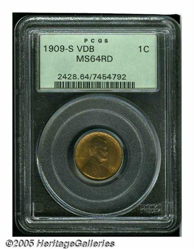 <B>1909-S VDB<1C> MS64 Red PCGS.</B></I> Because the issue was well made and their scarcity was immediately recognized, 1909-S VDB Cents are available in Mint State. However, its low mintage, its status as a short-lived subtype, and the immense popularity of the collectible Lincoln Cent series, ensure that quality pieces will always be under formidable demand. A well struck and shimmering olive-gold near-Gem, nearly unabraded and without relevant carbon. Certified in a green label PCGS holder.<BR><I>From The William Bickel Collection, Part One.</B></I>
