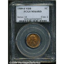 <B>1909-S VDB<1C> MS64 Red PCGS.</B></I> Deeply lustrous apricot-golden surfaces with several spots of steel-gray toning across the obverse and a large area on the reverse. One of numerous high grade '09-S VDBs to choose from in this year's Palm Beach Sale. <BR><BR><B>Important notice:</B> Heritage usually auctions material at the rate of 200-250 lots per hour. On some occasions eBay Live bid software or the Internet may not be able to keep up with the pace of the auction. We recommend placing a realistic absentee bid now as insurance to avoid disappointment. Occasionally the auctioneer may eliminate or reject an eBay Live bid, and the auctioneer may also reopen a lot after the close of the eBay live bidding (usually because we missed an audience bid), and may reject your bid even if it shows you as the winning bidder. By bidding via eBay Live, you agree that Heritage may award the lot to another bidder at its sole discretion under the circumstances described above or any other reasonable circumstances. Since eBay bids are not shown to us until we open the lot on the floor, we treat those bids just like floor bids. In most cases the floor responds before the eBay bid is presented to us, due to Internet lag time, so for consistency we have made it a policy that floor bids are always considered first over tie eBay live bids. Also please note that all Heritage lots purchased through eBay Live carry a 20% Buyer's Premium. Please make sure you read the Terms and Conditions before you bid.
