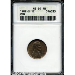 <B>1909-S VDB 1C MS64 Red and Brown ANACS.</B></I> Sharply struck with streaky brown overtones, as often seen on cents of both types from this year. A pleasing, near-Gem example with minimal evidence of carbon.