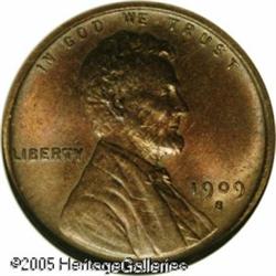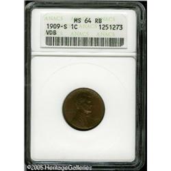 <B>1909-S VDB 1C MS64 Red and Brown ANACS.</B></I> The Holy Grail for Lincoln cent collectors, the acquisition of a 1909-S VDB cent usually marks the completion of the series. Lange, in his <I>The Complete Guide to Lincoln Cents,</B></I> states that: "While a number of other issues are more rare in Mint State, this coveted coin remains the rarest regular-issue entry in terms of the total number available in all grades. For many years it has also been the rare coin most widely known outside of the numismatic community." The present near-Gem example portrays about a 50-50 mix of orange-red luster and glossy-brown patina over both sides with limited "wood-grain" streaks that are common to cents of this era. With no distracting carbon spots, the eye appeal is expectantly impressive for the grade, and is further enhanced by the crisp strike on the devices. A minute contact mark on Lincoln's cheek is mentioned for accuracy. Lot:5371