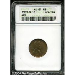 <B>1909-S VDB<1C> MS64 Red and Brown ANACS.</B></I> Actually gold, crimson, and tan with a good strike and virtually no mentionable marks or spots. Certainly a worthwhile, affordable Choice Mint State example of this ever-popular key date. <BR><BR><B>Important notice:</B> Heritage usually auctions material at the rate of 200-250 lots per hour. On some occasions eBay Live bid software or the Internet may not be able to keep up with the pace of the auction. We recommend placing a realistic absentee bid now as insurance to avoid disappointment. Occasionally the auctioneer may eliminate or reject an eBay Live bid, and the auctioneer may also reopen a lot after the close of the eBay live bidding (usually because we missed an audience bid), and may reject your bid even if it shows you as the winning bidder. By bidding via eBay Live, you agree that Heritage may award the lot to another bidder at its sole discretion under the circumstances described above or any other reasonable circumstances. Since eBay bids are not shown to us until we open the lot on the floor, we treat those bids just like floor bids. In most cases the floor responds before the eBay bid is presented to us, due to Internet lag time, so for consistency we have made it a policy that floor bids are always considered first over tie eBay live bids. Also please note that all Heritage lots purchased through eBay Live carry a 20% Buyer's Premium. Please make sure you read the Terms and Conditions before you bid.