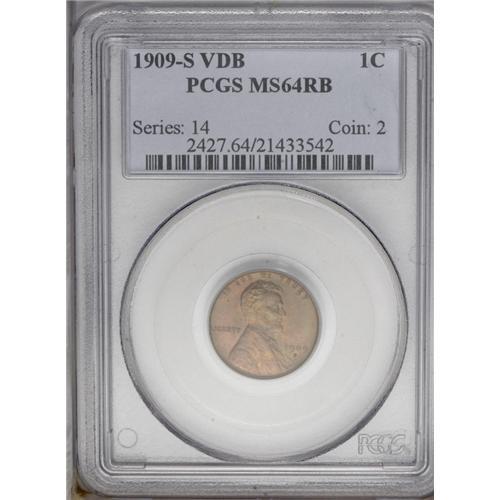 <B>1909-S VDB<1C> MS64 Red and Brown NGC.</B></I> This is a splendid example with deep lilac-orange color, fading to light brown. The surfaces are fully lustrous with only a few minor spots on each side. The 1909-S V.D.B. cent is the key-date in the series, and it is one of the most coveted varieties in numismatics. At least six different obverse dies were used, varying in mintmark position. All genuine examples have a distinctive mintmark with a small raised dot inside the upper loop and a tiny depression in the upper right serif.