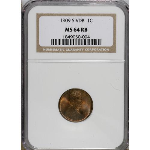 <B>1909-S VDB 1C MS64 Red and Brown NGC.</B></I> We present here a gorgeous example of this legendary issue. Glowing luster exudes from attractively toned copper-gold, sky-blue, and crimson surfaces that exhibit sharp delineation on the design elements, including fullness in the grains and lines of the wheat stalks. Blemish free, except for a light spot within the C of AMERICA. An outstanding addition to a high-grade Lincoln cent collection.<BR><BR><b>Shipping:</b> Coins & Currency (<a target="_blank" href="http://www.heritageauctions.com/common/shipping.php">view shipping information</a>)