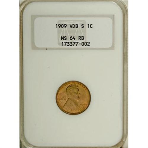 <B>1909-S VDB 1C MS64 Red and Brown NGC.</B></I> Beautiful coruscating luster and deep golden-reddish-brown toning are the highlights of this visually alluring near-Gem. A small spot is noted on Lincoln's lower lip. Carefully preserved and nearly mark-free, this piece represents an opportunity to acquire a high grade example of the most famous Lincoln cent issue.<BR><BR><B>Coin Engraver:</B> Victor D. Brenner<BR><BR><b>Shipping:</b> Coins & Currency (<a target="_blank" href="http://www.heritageauctions.com/common/shipping.php">view shipping information</a>)