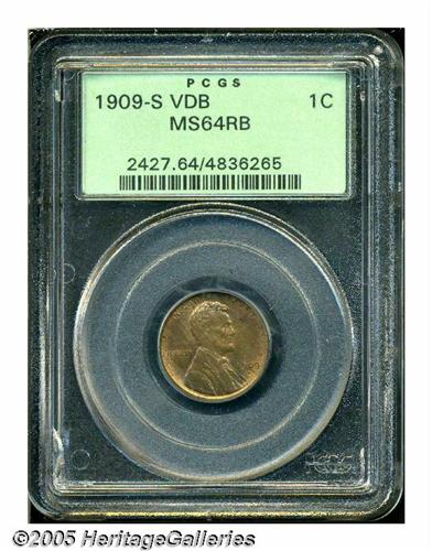 <B>1909-S VDB<1C> MS64 Red and Brown PCGS.</B></I> A lustrous and suitably struck Choice key date Cent. Essentially unabraded, although a spot on the upper right obverse field is mentioned for accuracy. The 1909-S VDB is enormously popular, due to its low mintage, first year status and the story behind the removal of the VDB initials. Encapsulated in a prior generation PCGS holder.