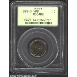 1909-S VDB 1C MS64 Red and Brown PCGS. Dappled glossy brown patina drifts over both sides with occasional flickers of lilac iridescence. Otherwise, the surfaces are lustrous with an orange-red sheen. Sharply impressed with surfaces that appear smooth enough to warrant a Gem grade. Important notice: We expect to be auctioning lots at the rate of 200-250 per hour. Sometimes eBay Premier live bid software cannot keep up with that pace, so we strongly recommend that you place a realistic proxy bid now as insurance to avoid disappointment. Also please note that all Heritage/CAA lots purchased through eBay Premier carry a 20% Buyer's Premium. Please make sure you read the Terms and Conditions.
