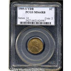 <B>1909-S VDB<1C> MS64 Red and Brown PCGS.</B></I> Ample hints of deep gold color emerges from the blended tan and lilac patina. An undisturbed, well struck, and shimmering key date Cent. Victor David Brenner was presumably disappointed that his initials were removed from the dies shortly after production of the new Lincoln Cent began in 1909, but ironically, it is because of their removal that his initials are highly publicized and widely sought by collectors. <BR><BR><B>Important notice:</B> Heritage usually auctions material at the rate of 200-250 lots per hour. On some occasions eBay Live bid software or the Internet may not be able to keep up with the pace of the auction. We recommend placing a realistic absentee bid now as insurance to avoid disappointment. Occasionally the auctioneer may eliminate or reject an eBay Live bid, and the auctioneer may also reopen a lot after the close of the eBay live bidding (usually because we missed an audience bid), and may reject your bid even if it shows you as the winning bidder. By bidding via eBay Live, you agree that Heritage may award the lot to another bidder at its sole discretion under the circumstances described above or any other reasonable circumstances. Since eBay bids are not shown to us until we open the lot on the floor, we treat those bids just like floor bids. In most cases the floor responds before the eBay bid is presented to us, due to Internet lag time, so for consistency we have made it a policy that floor bids are always considered first over tie eBay live bids. Also please note that all Heritage lots purchased through eBay Live carry a 20% Buyer's Premium. Please make sure you read the Terms and Conditions before you bid. </span></font></tr></table></td></tr></table>