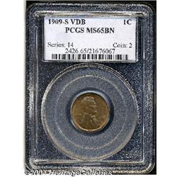 <B>1909-S VDB<1C> MS65 Brown PCGS.</B></I> Ample amounts of cherry-red patina remain in the crevices on each side. Otherwise, the surfaces are a medium tan-brown color. Well struck and unspotted overall, a premium example of this highly collectible issue. <BR><BR><B>Important notice:</B> Heritage usually auctions material at the rate of 200-250 lots per hour. On some occasions eBay Live bid software or the Internet may not be able to keep up with the pace of the auction. We recommend placing a realistic absentee bid now as insurance to avoid disappointment. Occasionally the auctioneer may eliminate or reject an eBay Live bid, and the auctioneer may also reopen a lot after the close of the eBay live bidding (usually because we missed an audience bid), and may reject your bid even if it shows you as the winning bidder. By bidding via eBay Live, you agree that Heritage may award the lot to another bidder at its sole discretion under the circumstances described above or any other reasonable circumstances. Since eBay bids are not shown to us until we open the lot on the floor, we treat those bids just like floor bids. In most cases the floor responds before the eBay bid is presented to us, due to Internet lag time, so for consistency we have made it a policy that floor bids are always considered first over tie eBay live bids. Also please note that all Heritage lots purchased through eBay Live carry a 20% Buyer's Premium. Please make sure you read the Terms and Conditions before you bid.