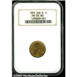 <B>1909-S VDB<1C> MS65 Red NGC.</B></I> Luminous gold color and unabraded surfaces provide substantial eye appeal. A satiny and exquisitely struck Gem of this perennially popular low mintage issue. Victor David Brenner's initials were considered too prominent although their placement on the lower reverse at 6 o'clock is seeming unobtrusive. Removed shortly after issue, the initials were restored without fanfare below the shoulder beginning in 1918. <BR><BR><B>Important notice:</B> Heritage usually auctions material at the rate of 200-250 lots per hour. On some occasions eBay Live bid software or the Internet may not be able to keep up with the pace of the auction. We recommend placing a realistic absentee bid now as insurance to avoid disappointment. Occasionally the auctioneer may eliminate or reject an eBay Live bid, and the auctioneer may also reopen a lot after the close of the eBay live bidding (usually because we missed an audience bid), and may reject your bid even if it shows you as the winning bidder. By bidding via eBay Live, you agree that Heritage may award the lot to another bidder at its sole discretion under the circumstances described above or any other reasonable circumstances. Since eBay bids are not shown to us until we open the lot on the floor, we treat those bids just like floor bids. In most cases the floor responds before the eBay bid is presented to us, due to Internet lag time, so for consistency we have made it a policy that floor bids are always considered first over tie eBay live bids. Also please note that all Heritage lots purchased through eBay Live carry a 20% Buyer's Premium. Please make sure you read the Terms and Conditions before you bid. </span></font></tr></table></td></tr></table>