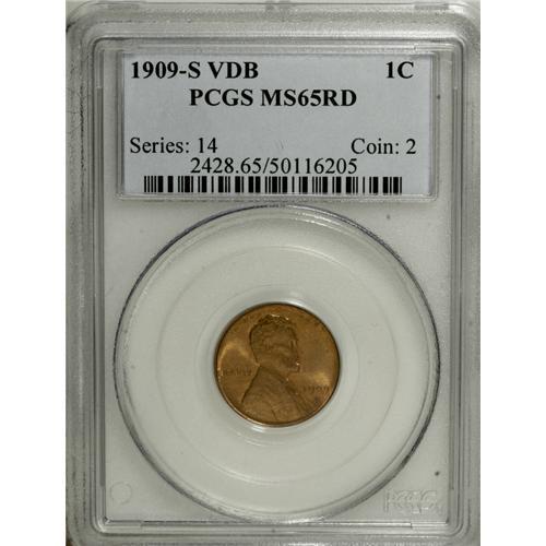 <B>1909-S VDB 1C MS65 Red PCGS.</B></I> Nearly every Lincoln cent collector can name the designer of the Lincoln cent, Victor David Brenner, mostly due to the placement of his initials on the back of the premier 1909 issues. Fewer know that he was a Lithuanian immigrant who anglicized his original birth name, Viktoras Barnauskas. The present example offers pleasing, even tan-gold coloration on both sides, with minimal distractions. The strike is a bit soft on Lincoln's coat and the obverse motto, and excellent luster radiates the surfaces. Under a loupe, an arcing scratch through the obverse motto, and correspondingly through the designer's initials on the lower reverse, appears to be some kind of die-ejection problem, as made.<BR><BR><b>Shipping:</b> Coins & Currency (<a target="_blank" href="http://www.heritageauctions.com/common/shipping.php">view shipping information</a>)