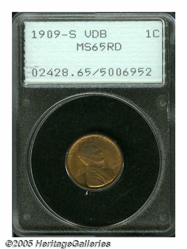 <B>1909-S VDB<1C> MS65 Red PCGS.</B></I> Well struck overall, each side shows bright reddish-golden color with signs of ample muting of color. This was probably a result of long time storage in an early PCGS holder. A desirable example of this popular key date Lincoln.
