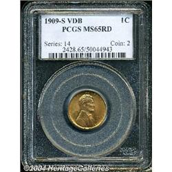 <B>1909-S VDB<1C> MS65 Red PCGS.</B></I> This first-year key is alive with frosty textured luster and bright, reddish-orange color. Sharply struck, as befits the issue, with nary a distracting abrasion. <BR><BR><B>Important notice:</B> Heritage usually auctions material at the rate of 200-250 lots per hour. On some occasions eBay Live bid software or the Internet may not be able to keep up with the pace of the auction. We recommend placing a realistic absentee bid now as insurance to avoid disappointment. Occasionally the auctioneer may eliminate or reject an eBay Live bid, and the auctioneer may also reopen a lot after the close of the eBay live bidding (usually because we missed an audience bid), and may reject your bid even if it shows you as the winning bidder. By bidding via eBay Live, you agree that Heritage may award the lot to another bidder at its sole discretion under the circumstances described above or any other reasonable circumstances. Since eBay bids are not shown to us until we open the lot on the floor, we treat those bids just like floor bids. In most cases the floor responds before the eBay bid is presented to us, due to Internet lag time, so for consistency we have made it a policy that floor bids are always considered first over tie eBay live bids. Also please note that all Heritage lots purchased through eBay Live carry a 20% Buyer's Premium. Please make sure you read the Terms and Conditions before you bid.