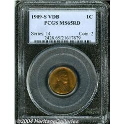 <B>1909-S VDB<1C> MS65 Red PCGS.</B></I> Remarkably fresh and lustrous, with absolutely lovely orange-red coloration and the nearly complete absence of surface blemishes on each side. A faint toning streak vertically bisects the left side of the obverse, and there are several flyspecks on the reverse, but they are tiny. A splendid, fully red key date Gem. <BR><BR><B>Important notice:</B> Heritage usually auctions material at the rate of 200-250 lots per hour. On some occasions eBay Live bid software or the Internet may not be able to keep up with the pace of the auction. We recommend placing a realistic absentee bid now as insurance to avoid disappointment. Occasionally the auctioneer may eliminate or reject an eBay Live bid, and the auctioneer may also reopen a lot after the close of the eBay live bidding (usually because we missed an audience bid), and may reject your bid even if it shows you as the winning bidder. By bidding via eBay Live, you agree that Heritage may award the lot to another bidder at its sole discretion under the circumstances described above or any other reasonable circumstances. Since eBay bids are not shown to us until we open the lot on the floor, we treat those bids just like floor bids. In most cases the floor responds before the eBay bid is presented to us, due to Internet lag time, so for consistency we have made it a policy that floor bids are always considered first over tie eBay live bids. Also please note that all Heritage lots purchased through eBay Live carry a 20% Buyer's Premium. Please make sure you read the Terms and Conditions before you bid.