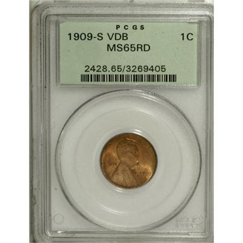 <B>1909-S VDB 1C MS65 Red PCGS.</B></I> Light orange and gold streaks invigorate this lustrous and meticulously struck Gem. The VDB initials are boldly impressed, unlike some Uncirculated examples seen. Close inspection reveals no significant contact marks or unsightly spots. Encased in a green label holder. David Lange (2005) writes: "The Holy Grail for Lincoln cent collectors, the acquisition of a 1909-S VDB cent usually marks the completion of the series."<BR><BR><b>Shipping:</b> Coins & Currency (<a target="_blank" href="http://www.heritageauctions.com/common/shipping.php">view shipping information</a>)