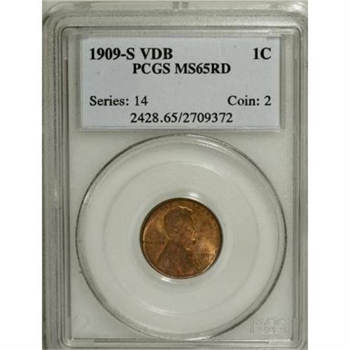 <B>1909-S VDB 1C MS65 Red PCGS.</B></I> Our usual fine selection of this popular 20th century key is offered in this year's ANA Sale. This boldly struck Gem exhibits a soft, frosted finish with bits of pale orange and lilac patina interspersed over each side. While this produces the slightest mellowing effect, the surfaces are free from appreciable carbon.<BR><BR><B>Coin Engraver:</B> Victor D. Brenner<BR><BR><b>Shipping:</b> Coins & Currency (<a target="_blank" href="http://www.heritageauctions.com/common/shipping.php">view shipping information</a>\)