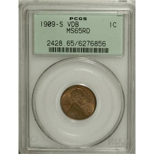 <B>1909-S VDB 1C MS65 Red PCGS.</B></I> A rock-solid Gem example of this prized first-year Lincoln cent issue, being well struck with speckled reddish-gold patina over both sides, producing an attractive woodgrain finish that is highlighted by intense mint luster. Only the faintest of carbon specks appear on either side, and contact marks are nonexistent.<BR><BR><B>Coin Engraver:</B> Victor D. Brenner<BR><BR><b>Shipping:</b> Coins & Currency (<a target="_blank" href="http://www.heritageauctions.com/common/shipping.php">view shipping information</a>)