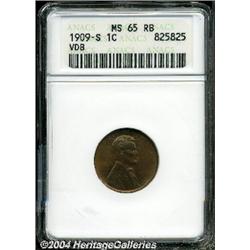<B>1909-S VDB<1C> MS65 Red and Brown ANACS.</B></I> Fully struck with much original red color and significant areas of deep cherry-red. No distracting abrasions are present and there is only a couple of miniscule carbon spots on the obverse. A pleasing example of this scarce key issue. <BR><BR><B>Important notice:</B> Heritage usually auctions material at the rate of 200-250 lots per hour. On some occasions eBay Live bid software or the Internet may not be able to keep up with the pace of the auction. We recommend placing a realistic absentee bid now as insurance to avoid disappointment. Occasionally the auctioneer may eliminate or reject an eBay Live bid, and the auctioneer may also reopen a lot after the close of the eBay live bidding (usually because we missed an audience bid), and may reject your bid even if it shows you as the winning bidder. By bidding via eBay Live, you agree that Heritage may award the lot to another bidder at its sole discretion under the circumstances described above or any other reasonable circumstances. Since eBay bids are not shown to us until we open the lot on the floor, we treat those bids just like floor bids. In most cases the floor responds before the eBay bid is presented to us, due to Internet lag time, so for consistency we have made it a policy that floor bids are always considered first over tie eBay live bids. Also please note that all Heritage lots purchased through eBay Live carry a 20% Buyer's Premium. Please make sure you read the Terms and Conditions before you bid.