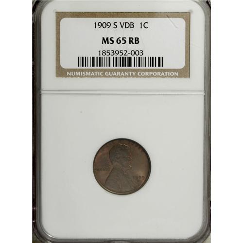 <B>1909-S VDB 1C MS65 Red and Brown NGC.</B></I> Considerable mint orange is apparent on this Gem key-date Lincoln cent, intermixed with occasional blushes of bluish-tan. Sharp definition is noted on the design features, including fully delineated lines in the wheat stalks. The surfaces on both sides are quite clean, revealing no significant abrasions or unsightly spotting.<BR><I>From The Twin Hollows Collection, Part Two.</B></I><BR><BR><b>Shipping:</b> Coins & Currency (<a target="_blank" href="http://www.heritageauctions.com/common/shipping.php">view shipping information</a>)