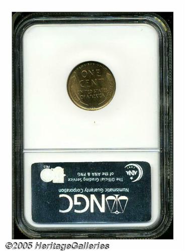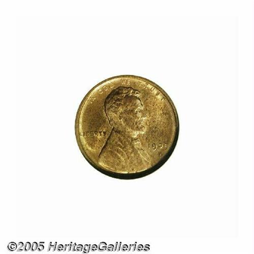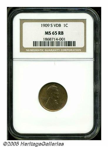 <B>1909-S VDB<1C> MS65 Red and Brown NGC.</B></I> The 1909-S VDB is enormously popular, due to its low mintage, first year status and the story behind the removal of the VDB initials. It is, perhaps, the most well-known collector date coin in the 20th century. This specimen is worthy of any high-grade collection, being well struck, devoid of significant contact marks, and displaying a pretty coppery-gold color that is just beginning to tone to a light tan. The obverse is occupied by numerous toning freckles. NGC has certified only 41 pieces finer (6/05).