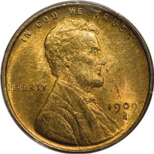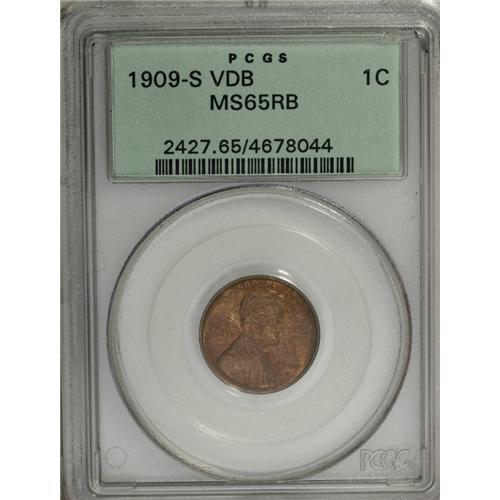 <B>1909-S VDB 1C MS65 Red and Brown PCGS.</B></I> This coin shows the "woodgrain" texture often seen on many 1909 cents. It is more the variegated color from this woodgrain effect, rather than any actual brown that gives the coin its Red and Brown designation. Close examination reveals a wide variation in colors from almost yellow-gold to orange-red to deep cherry-red. Two small abrasions are noted, on Lincoln's temple and cheekbone, respectively.<BR><BR><b>Shipping:</b> Coins & Currency (<a target="_blank" href="http://www.heritageauctions.com/common/shipping.php">view shipping information</a>)