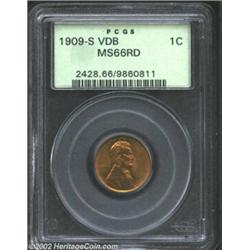 1909-S VDB 1C MS66 Red PCGS. Sharply defined throughout with lustrous red surfaces that show the streakiness that is so often encountered on copper coins from this year. A glowing, upper-level MS66 and a very scarce item as such. Important notice: We expect to be auctioning lots at the rate of 200-250 per hour. Sometimes eBay Premier live bid software cannot keep up with that pace, so we strongly recommend that you place a realistic proxy bid now as insurance to avoid disappointment. Also please note that all Heritage/CAA lots purchased through eBay Premier carry a 20% Buyer's Premium. Please make sure you read the Terms and Conditions.