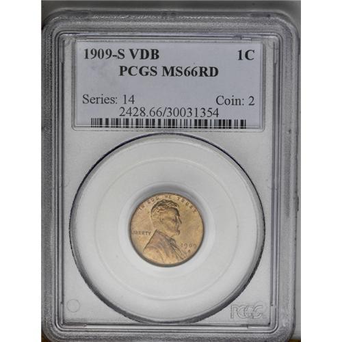 <B>1909-S VDB<1C> MS66 Red PCGS.</B></I> This is a remarkable Premium Gem example with fully brilliant red luster on both sides. All of the design elements are sharply detailed, and the surfaces are pristine without any spots or other blemishes. The only reason we can find for a grade below the Superb Gem level is a slight mellowing of the original color. The "SVDB" is a favorite with collectors, and is well-known to specialists and novice collectors alike. It is possibly the single most widely known coin in all of American numismatics. PCGS has only certified nine full Red examples of this date in higher grades (5/06).