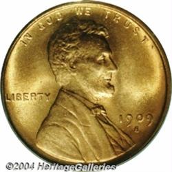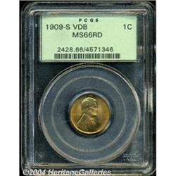 <B>1909-S VDB<1C> MS66 Red PCGS.</B></I> The San Francisco Mint's initial production of 1909-dated Lincoln cents comprised 484,000 pieces with the designer's initials VDB on the reverse. This issue boasts the lowest mintage in the business strike Lincoln Cent series. Although widely hoarded as a first-year issue, the '09-S VDB is scarce when compared with the number of numismatists who want/need a representative of this issue for their collections. Bright golden-orange luster cascades over the fully impressed features that characterize both sides of this nearly abrasion-free Gem. Virtually unimprovable in terms of both technical quality and aesthetic appeal. Population: 144 in 66, 9 finer (7/04). <BR><BR><B>Important notice:</B> Heritage usually auctions material at the rate of 200-250 lots per hour. On some occasions eBay Live bid software or the Internet may not be able to keep up with the pace of the auction. We recommend placing a realistic absentee bid now as insurance to avoid disappointment. Occasionally the auctioneer may eliminate or reject an eBay Live bid, and the auctioneer may also reopen a lot after the close of the eBay live bidding (usually because we missed an audience bid), and may reject your bid even if it shows you as the winning bidder. By bidding via eBay Live, you agree that Heritage may award the lot to another bidder at its sole discretion under the circumstances described above or any other reasonable circumstances. Since eBay bids are not shown to us until we open the lot on the floor, we treat those bids just like floor bids. In most cases the floor responds before the eBay bid is presented to us, due to Internet lag time, so for consistency we have made it a policy that floor bids are always considered first over tie eBay live bids. Also please note that all Heritage lots purchased through eBay Live carry a 20% Buyer's Premium. Please make sure you read the Terms and Conditions before you bid. </span></font></tr></table></td></tr></table>
