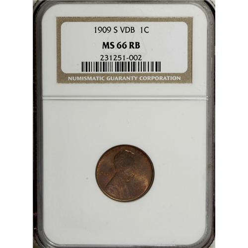 <B>1909-S VDB 1C MS66 Red and Brown NGC.</B></I> Some browning is seen on the obverse but the reverse is primarily cherry-red. Close examination reveals light woodgrain streaking, a common surface characteristic on all cents from 1909. Well struck with no noticeable marks on either side. Glowing surfaces overall and a pleasing coin in all regards.<BR><BR><b>Shipping:</b> Coin/Currency (<a target="_blank" href="http://www.heritageauctions.com/common/shipping.php">view shipping information</a>)