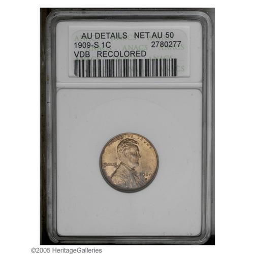 1909-S VDB 1C --Recolored--ANACS. AU Details, Net AU50. 1909-S VDB[1C]--Recolored--ANACS. AU Details