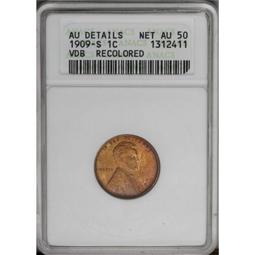 <B>1909-S VDB<1C>--Recolored--ANACS. AU Details. Net AU50.</B></I> A deceptively recolored orange-gold piece with blushes of lilac-rose along the right borders. This well struck key date cent shows little indication of highpoint friction.<BR><I>From The Empire Tree Collection.</B></I>
