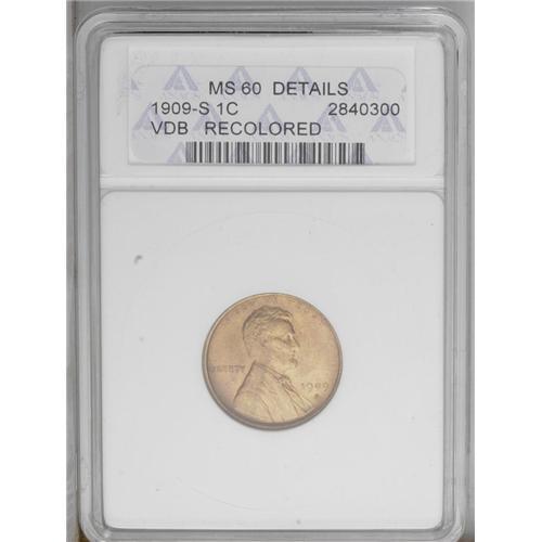 <B>1909-S VDB<1C>--Recolored--ANACS. MS60 Details.</B></I> Although designated "Recolored" on the ANACS holder, the surfaces present a pleasing orange-gold color imbued with wisps of light blue on the obverse. Sharply struck on the design elements, including complete definition on the wheat stalks. There are no serious abrasions or ugly spots. Despite the disclaimer, this piece should be given serious consideration by the collector seeking to acquire this key date for his/her high-grade Lincoln cent collection. <BR><BR><B>Important notice:</B> Heritage usually auctions material at the rate of 200-250 lots per hour. On some occasions eBay Live bid software or the Internet may not be able to keep up with the pace of the auction. We recommend placing a realistic absentee bid now as insurance to avoid disappointment. Occasionally the auctioneer may eliminate or reject an eBay Live bid, and the auctioneer may also reopen a lot after the close of the eBay live bidding (usually because we missed an audience bid), and may reject your bid even if it shows you as the winning bidder. By bidding via eBay Live, you agree that Heritage may award the lot to another bidder at its sole discretion under the circumstances described above or any other reasonable circumstances. Since eBay bids are not shown to us until we open the lot on the floor, we treat those bids just like floor bids. In most cases the floor responds before the eBay bid is presented to us, due to Internet lag time, so for consistency we have made it a policy that floor bids are always considered first over tie eBay live bids. Also please note that all Heritage lots purchased through eBay Live carry a 20% Buyer's Premium. Please make sure you read the Terms and Conditions before you bid. This lot is being auctioned in conjunction with a live floor auction by Heritage Galleries & Auctioneers. All final auction and invoice information will be supplied by Heritage Galleries & Auctioneers, and all other information should be considered preliminary. Lot:590 <BR><BR><B>Winning Notification and Billing:</B> After the FINAL session in this auction is complete, Heritage will send e-mail and snail mail invoices. This process normally takes several days. All final auction and invoice information will be supplied by Heritage Galleries & Auctioneers, and all other information should be considered preliminary. <BR><BR>This auction will be conducted on a live auction floor and over the Internet through eBay Live. If you choose to place an absentee bid, please take a moment to <font color='#0000ff'><u><a href='http://pages.ebay.com/liveauctions/help/before/laabsentee.html'>learn how eBay Live absentee bidding works</a></u></font><font color='#000000'>
