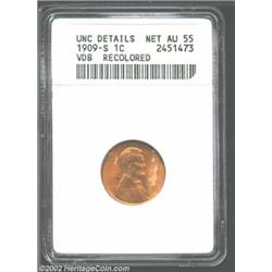 1909-S VDB 1C--Recolored--ANACS. Unc Details, Net AU55. Sharply struck and well defined with color that is attractive but just a tad too bright to be believable. Important notice: We expect to be auctioning lots at the rate of 200-250 per hour. Sometimes eBay Premier live bid software cannot keep up with that pace, so we strongly recommend that you place a realistic proxy bid now as insurance to avoid disappointment. Also please note that all Heritage/CAA lots purchased through eBay Premier carry a 20% Buyer's Premium. Please make sure you read the Terms and Conditions.