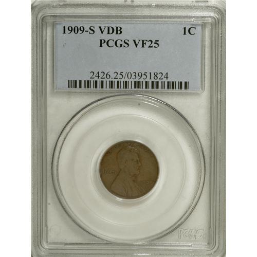<B>1909-S VDB 1C VF25 PCGS.</B></I> This unblemished medium brown key date cent has a hint of gunmetal-blue on the highpoints. The lines in the wheat ears are mostly separated, and all legends are bold.<BR><BR><b>Shipping:</b> Coins & Currency (<a target="_blank" href="http://www.heritageauctions.com/common/shipping.php">view shipping information</a>)