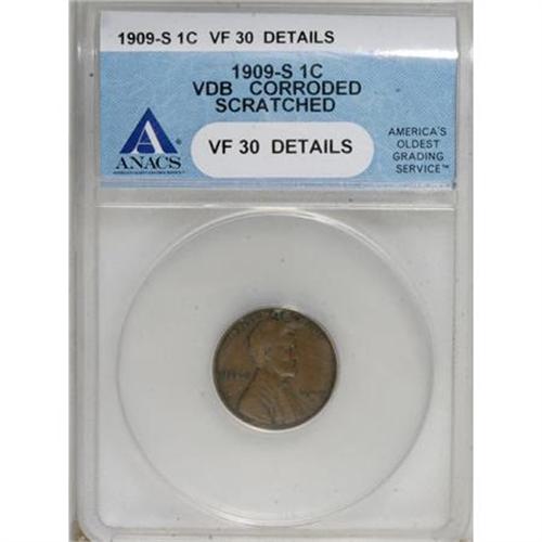 <B>1909-S VDB 1C --Corroded, Scratched--ANACS. VF30 Details.</B></I> NGC Census: (124/1746). PCGS Population (331/3048). Mintage: 484,000. Numismedia Wsl. Price for NGC/PCGS coin in VF30: $901. (#2426)<BR><BR><B>Coin Engraver:</B> Victor D. Brenner<BR><BR><b>Shipping:</b> Coins & Currency (<a target="_blank" href="http://www.heritageauctions.com/common/shipping.php">view shipping information</a>)