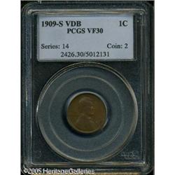<B>1909-S VDB 1C VF30 PCGS.</B></I> This key to the Lincoln cent series has medium brown patina, with a few areas of brighter color in the recesses. Lot:5365