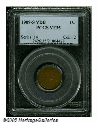 <B>1909-S VDB<1C> VF35 PCGS.</B></I> A lightly circulated key date example with glossy chocolate-brown surfaces, a small degree of mottled and streaky darker patina, and no detracting contact marks. Well struck and evenly worn, with good details for the VF35 grade level.