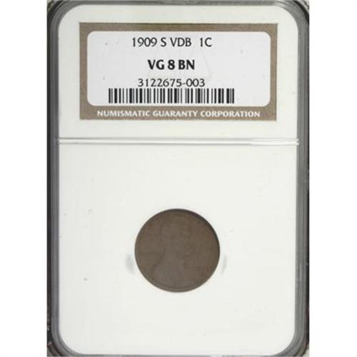 <B>1909-S VDB 1C VG8 NGC.</B></I> Deep chocolate-brown surfaces show few marks, just plenty of honest wear. A significantly circulated but eminently desirable issue of this long-coveted Lincoln key.<BR><I>From The John Stimson, Sr. Collection, Part Two.</B></I><BR><BR><B>Coin Engraver:</B> Victor D. Brenner<BR><BR><b>Shipping:</b> Coins & Currency (<a target="_blank" href="http://www.heritageauctions.com/common/shipping.php">view shipping information</a>)