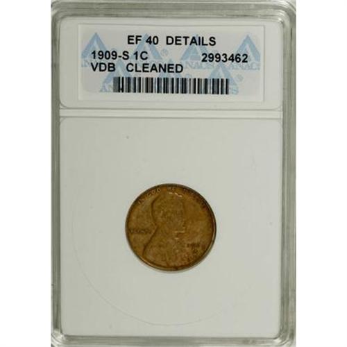 <B>1909-S VDB 1C --Cleaned--ANACS. XF40 Details.</B></I> Unnaturally bright given the moderate wear on Lincoln's cheekbone. The lime and gold surfaces exhibit few consequential marks. The VDB initials are bold.<BR><BR><B>Coin Engraver:</B> Victor D. Brenner<BR><BR><b>Shipping:</b> Coins & Currency (<a target="_blank" href="http://www.heritageauctions.com/common/shipping.php">view shipping information</a>)