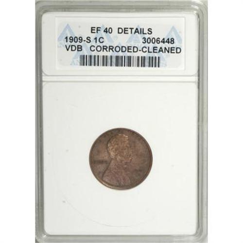 <B>1909-S VDB 1C --Corroded, Cleaned--ANACS. XF40 Details.</B></I> The pale orange color is suspect given the moderate wear on the cheekbone and ear, and the lower left reverse has a couple of small blue-green spots. Some mint luster remains on this boldly defined key date cent.<BR><BR><B>Coin Engraver:</B> Victor D. Brenner<BR><BR><b>Shipping:</b> Coins & Currency (<a target="_blank" href="http://www.heritageauctions.com/common/shipping.php">view shipping information</a>)