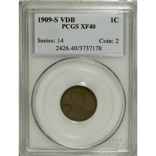 <B>1909-S VDB 1C XF40 PCGS.</B></I> A chocolate-brown representative of this coveted collector coin. The left reverse has a small amount of carbon, but marks are insignificant, and the lines in the wheat ears are sharp.<BR><BR><b>Shipping:</b> Coins & Currency (<a target="_blank" href="http://www.heritageauctions.com/common/shipping.php">view shipping information</a>)
