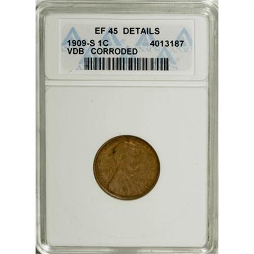 <B>1909-S VDB 1C --Corroded--ANACS. XF45 Details.</B></I> A sharp olive-gold example with bold VDB initials. A glass reveals minute obverse pitting, and the reverse has distributed tiny freckles of verdigris. A pair of faint hair-thin marks are noted above the date and across the cheekbone.<BR><BR><B>Coin Engraver:</B> Victor D. Brenner<BR><BR><b>Shipping:</b> Coins & Currency (<a target="_blank" href="http://www.heritageauctions.com/common/shipping.php">view shipping information</a>)