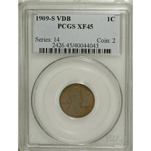 <B>1909-S VDB 1C XF45 PCGS.</B></I> Hints of subdued pumpkin-orange visit the margins of this otherwise chocolate-brown Choice XF piece. Well struck with light, even wear and few marks, a desirable example of this coveted issue.<BR><BR><B>Coin Engraver:</B> Victor D. Brenner<BR><BR><b>Shipping:</b> Coins & Currency (<a target="_blank" href="http://www.heritageauctions.com/common/shipping.php">view shipping information</a>)
